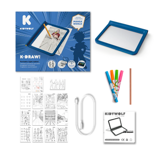 Met K-DRAW-PRO Manga bedenken kinderen hun eigen helden, geïnspireerd door de mangawereld. Dankzij een slim systeem kalkeren ze gezichten, kapsels, outfits en gezichtsuitdrukkingen eindeloos – meer dan 1000 combinaties zijn mogelijk. Het lichtbord is dubbelzijdig en biedt ruimte voor vrije, leuke en creatieve expressie.