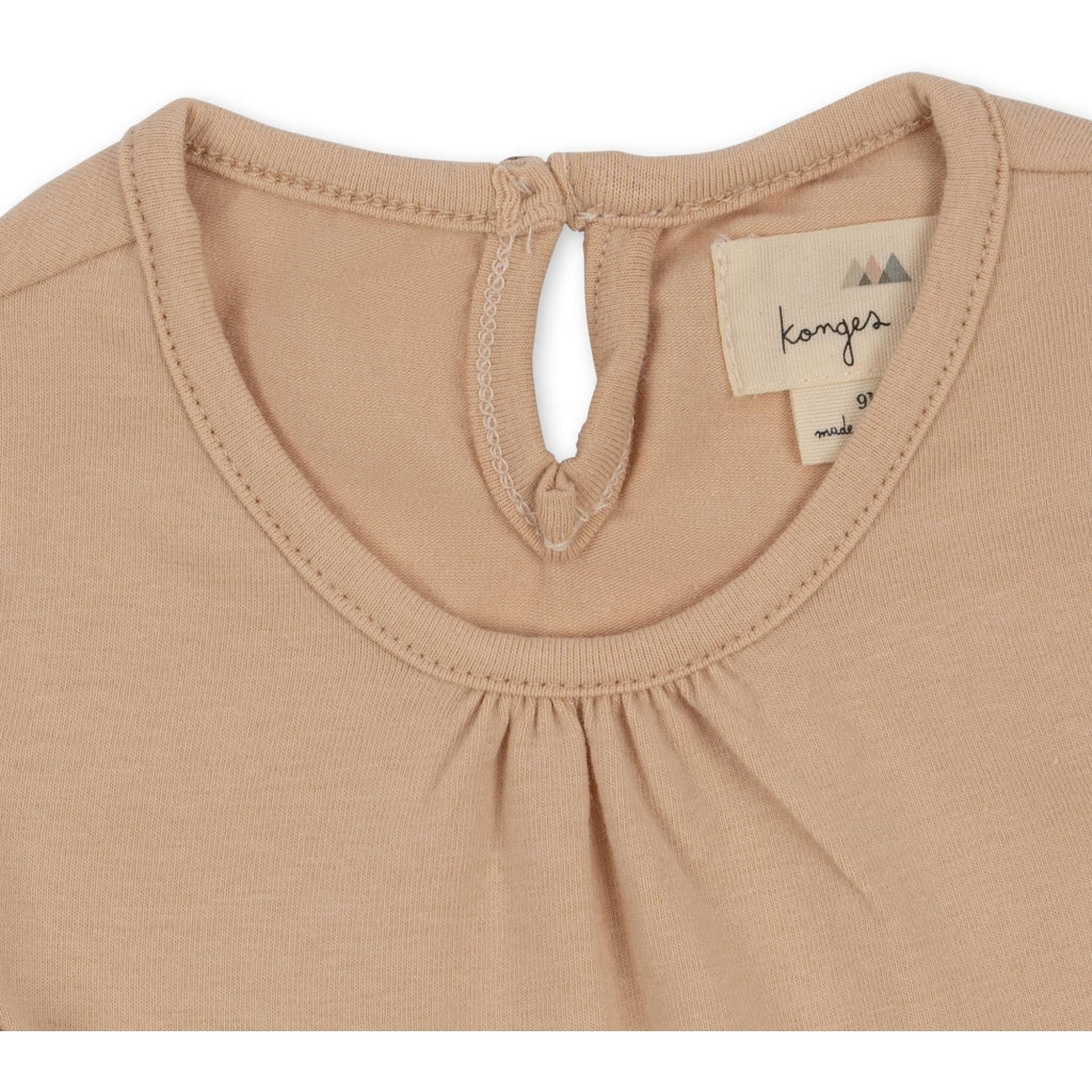 Zachte ballerinajurk met lange mouwen met pofmouwen en een drielaagse tule rok. Sluit met een enkele parelmoeren knoop aan de achterkant.