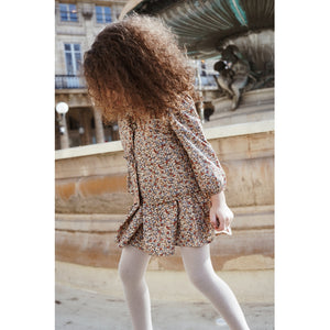 Jurk gemaakt van 100 procent biologisch katoen. Ontworpen met een ronde kraag met ruches en elastische manchetten. Heeft een zachte elastische taille die uitloopt in een wijd uitlopende rok. Sluit in de neklijn achter met drie parelmoer knoopjes.