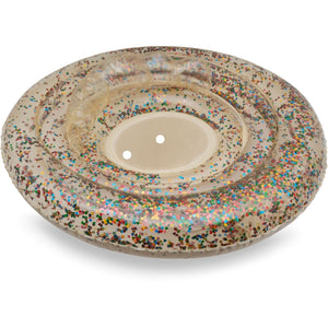 Transparante opblaasbare zwemring gemaakt van duurzaam PVC ontworpen met glitter en confetti aan de binnenkant.