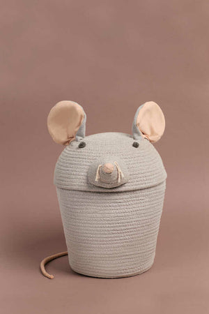 Nieuwsgierig als een rat, is de Renata the Rat mand handgemaakt met behulp van gevlochten koorden gemaakt van vezels van gerecyclede PET-flessen gemengd met onze katoenkleuren. Met een licht kegelvormig onderstuk in de kleur Pearl Grey en een geborduurde spitse neus, de grijze canvas oren en de roze lange staart geven de finishing touch aan deze mand.