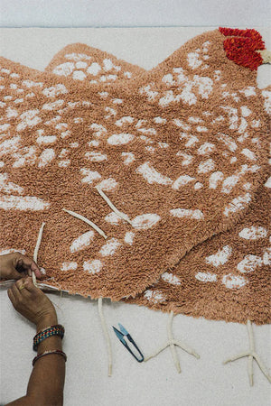Tok, tok! Dit handgemaakte katoenen tapijt in de vorm van een kip heeft
