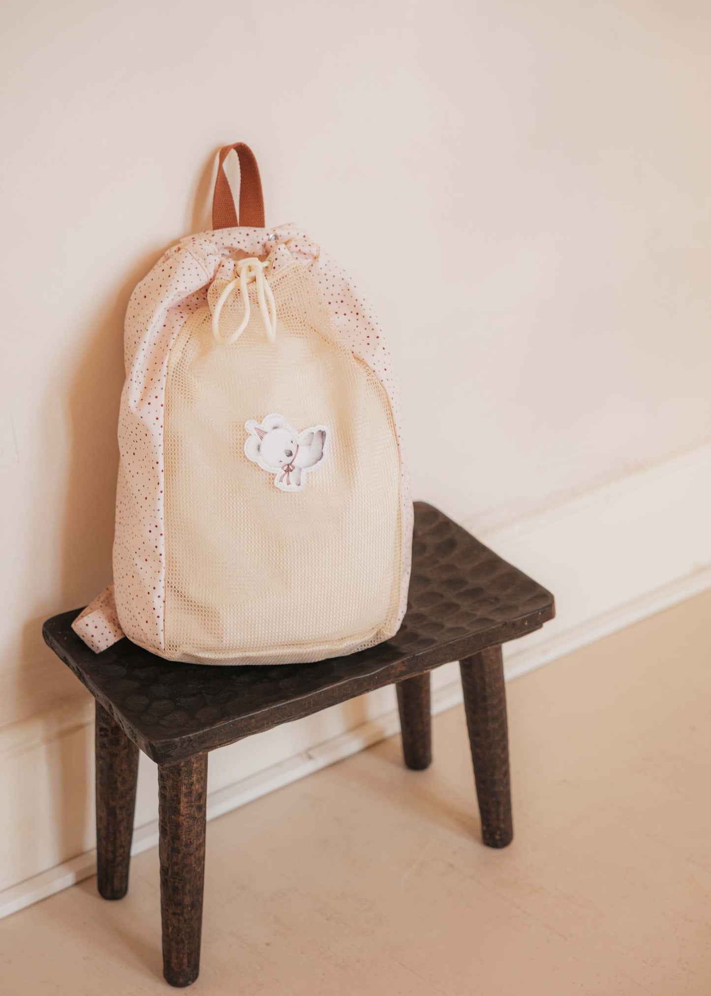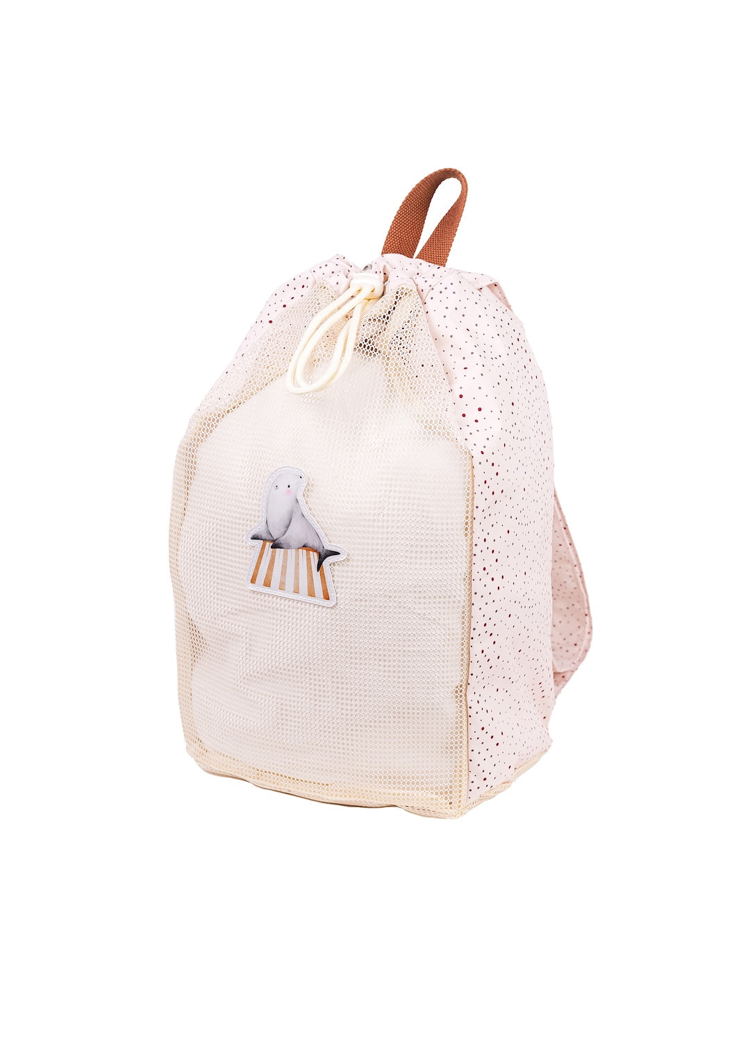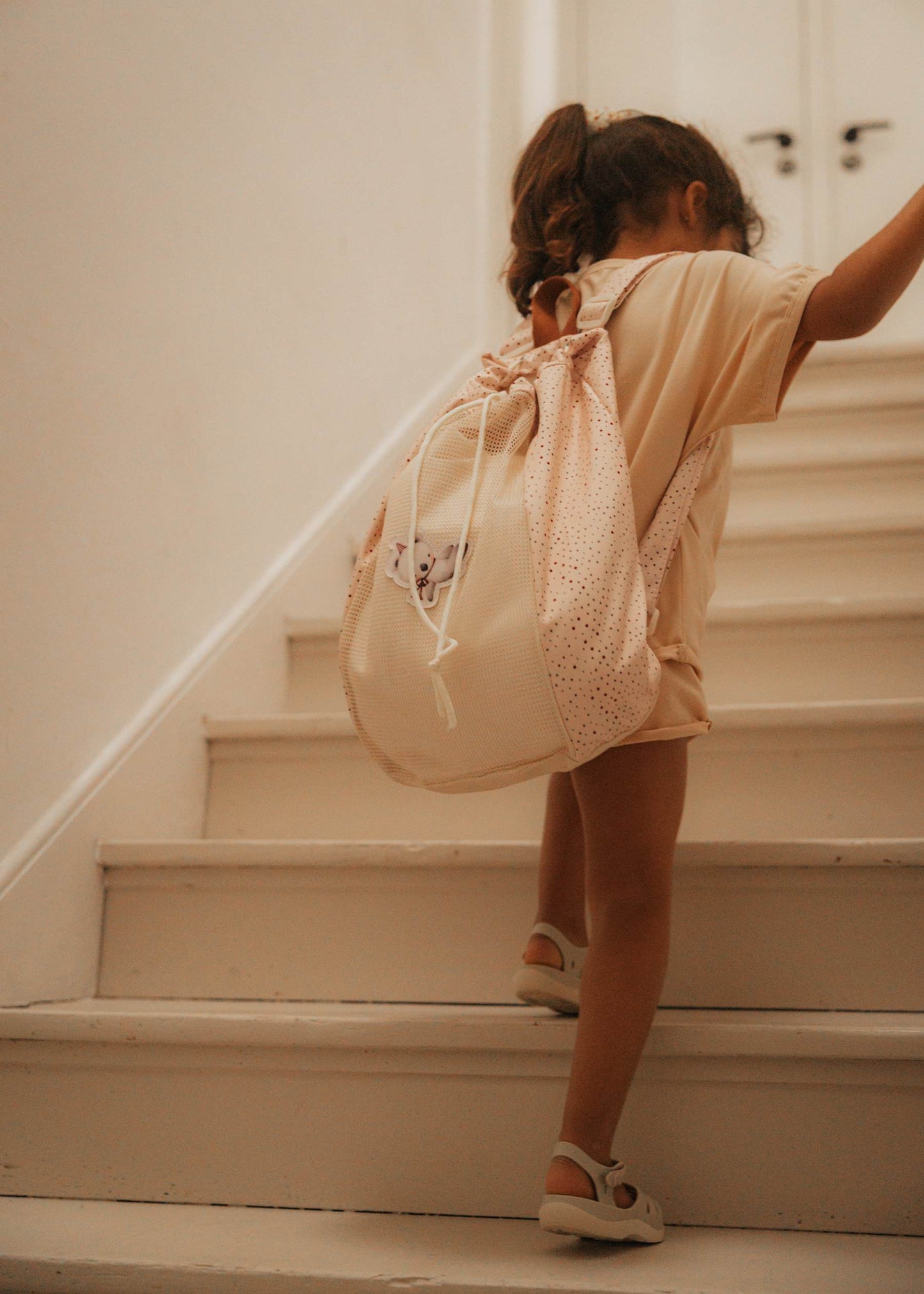 Rugzak van gaas voor kinderen om mee te nemen naar het strand.