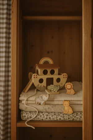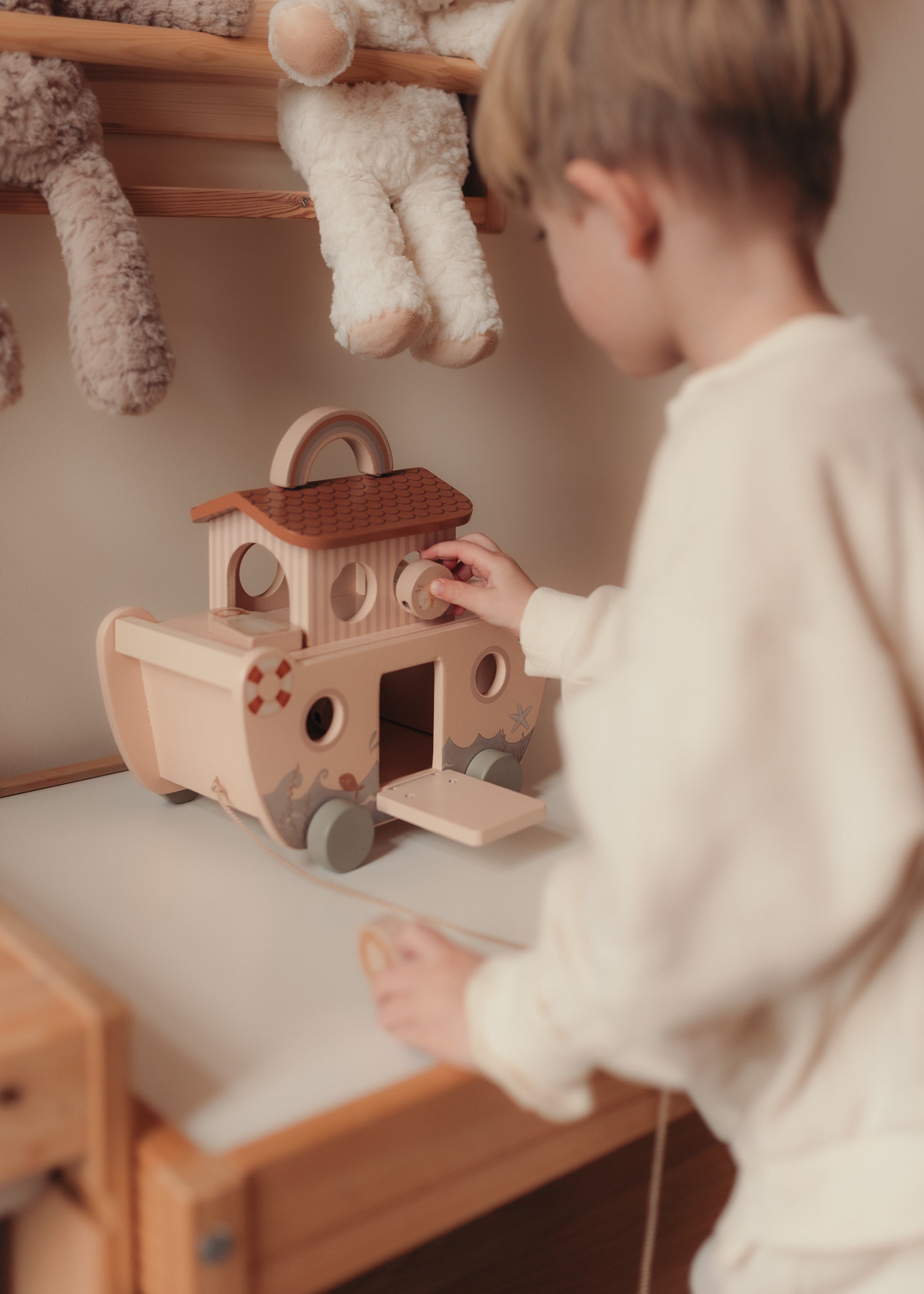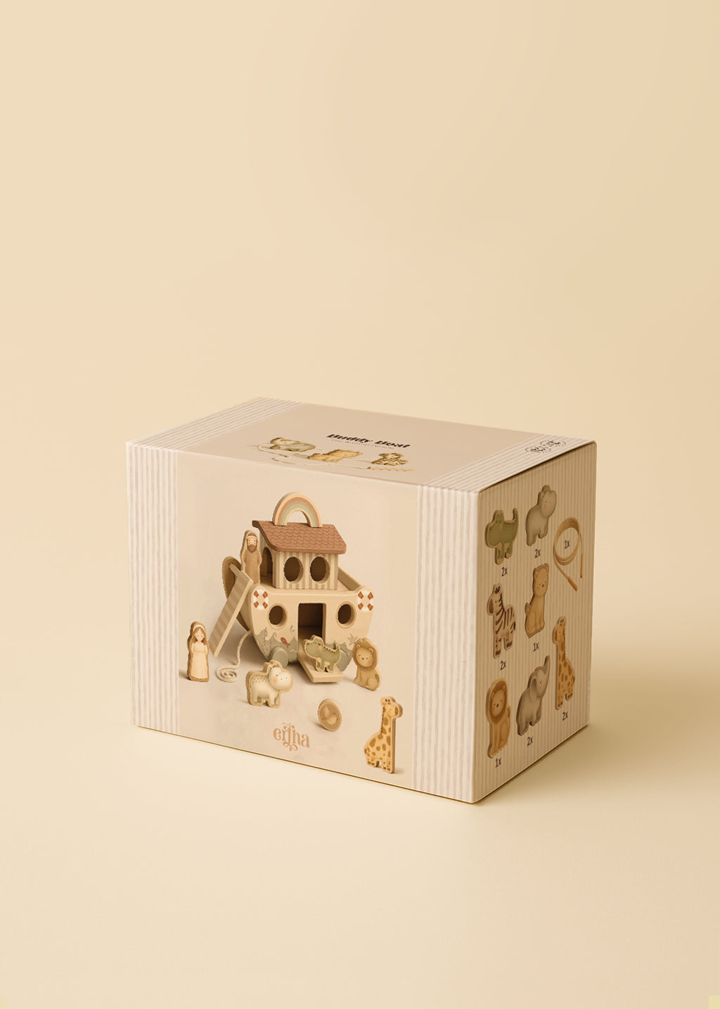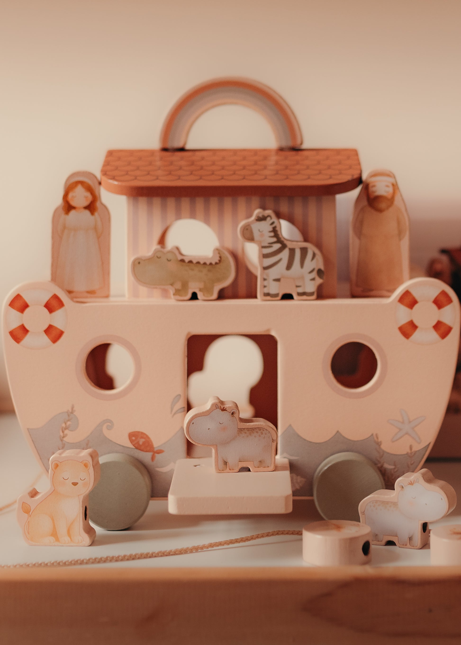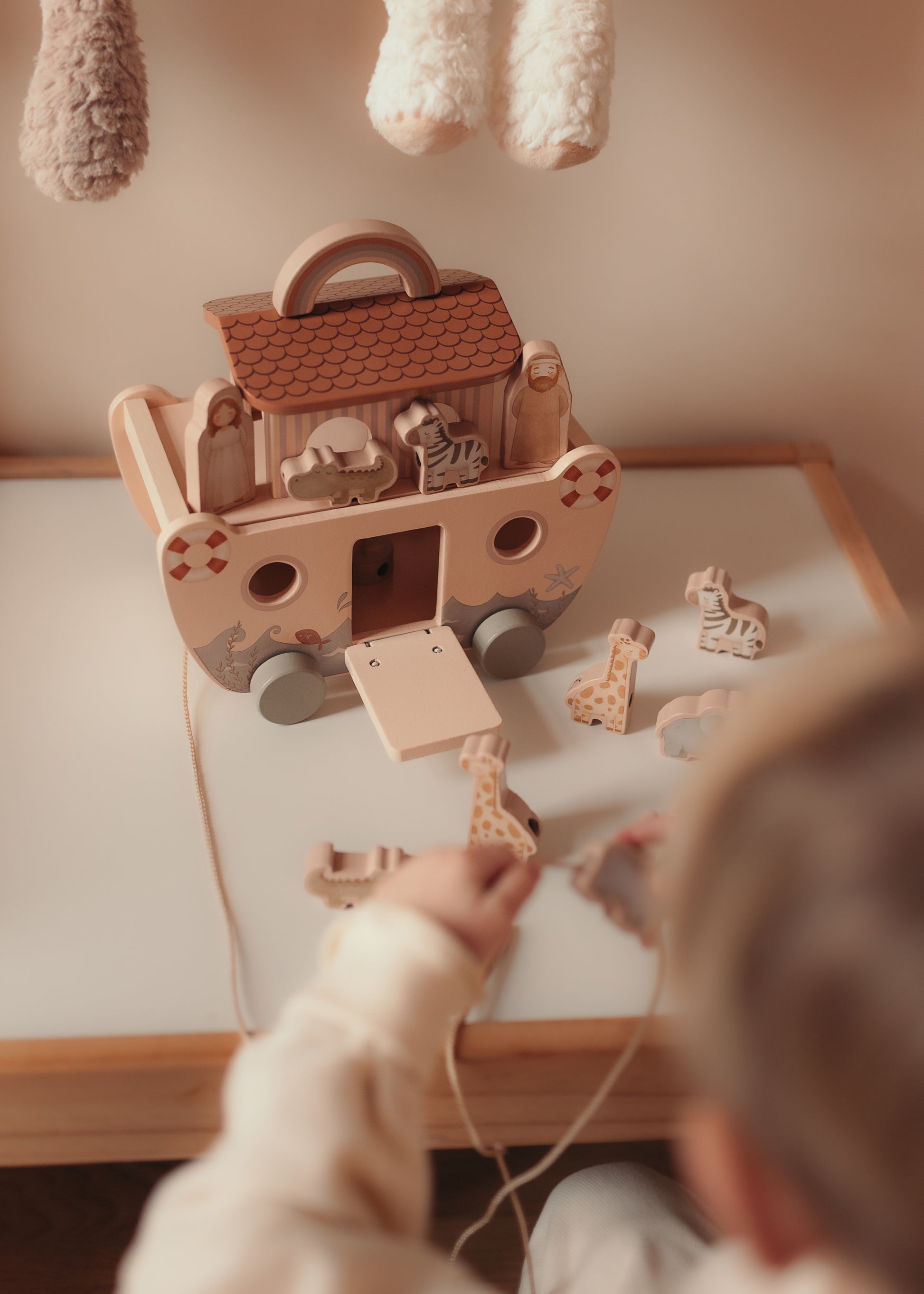 Bevat 22 onderdelen: 14 dieren, een bootje op wieltjes, een regenboog, een trapje en een touwtje met een houten uiteinde om de dieren aan te rijgen, waardoor kleintjes hun fijne motoriek kunnen ontwikkelen. Perfect om mee te spelen, te leren en eindeloze avonturen te beleven!