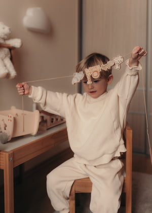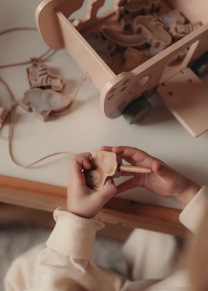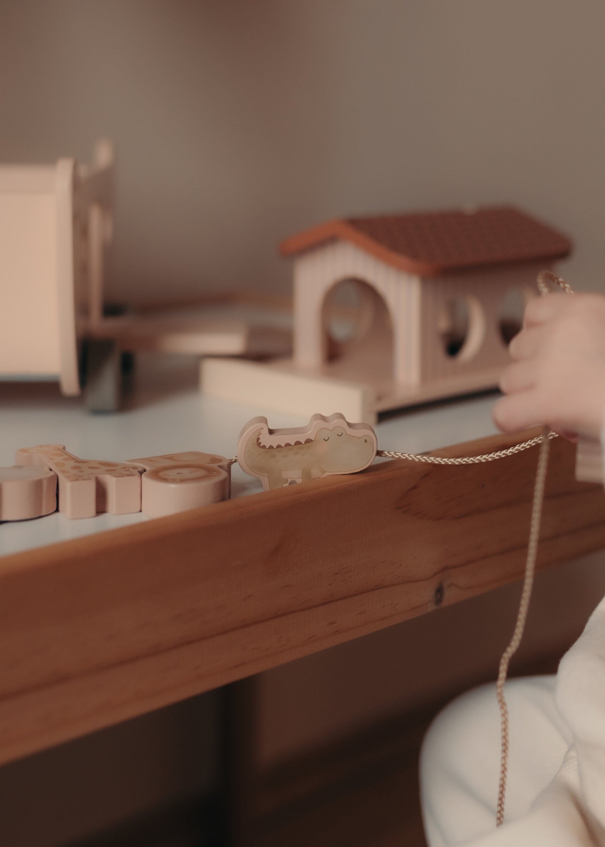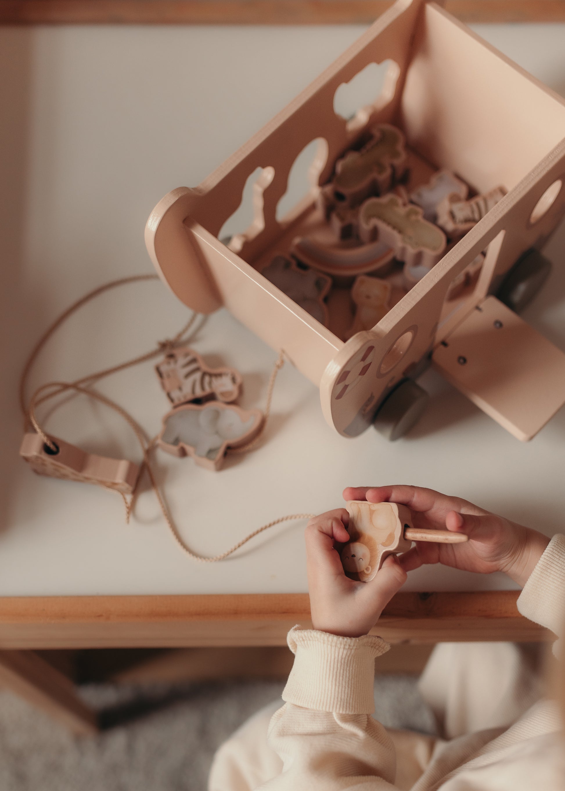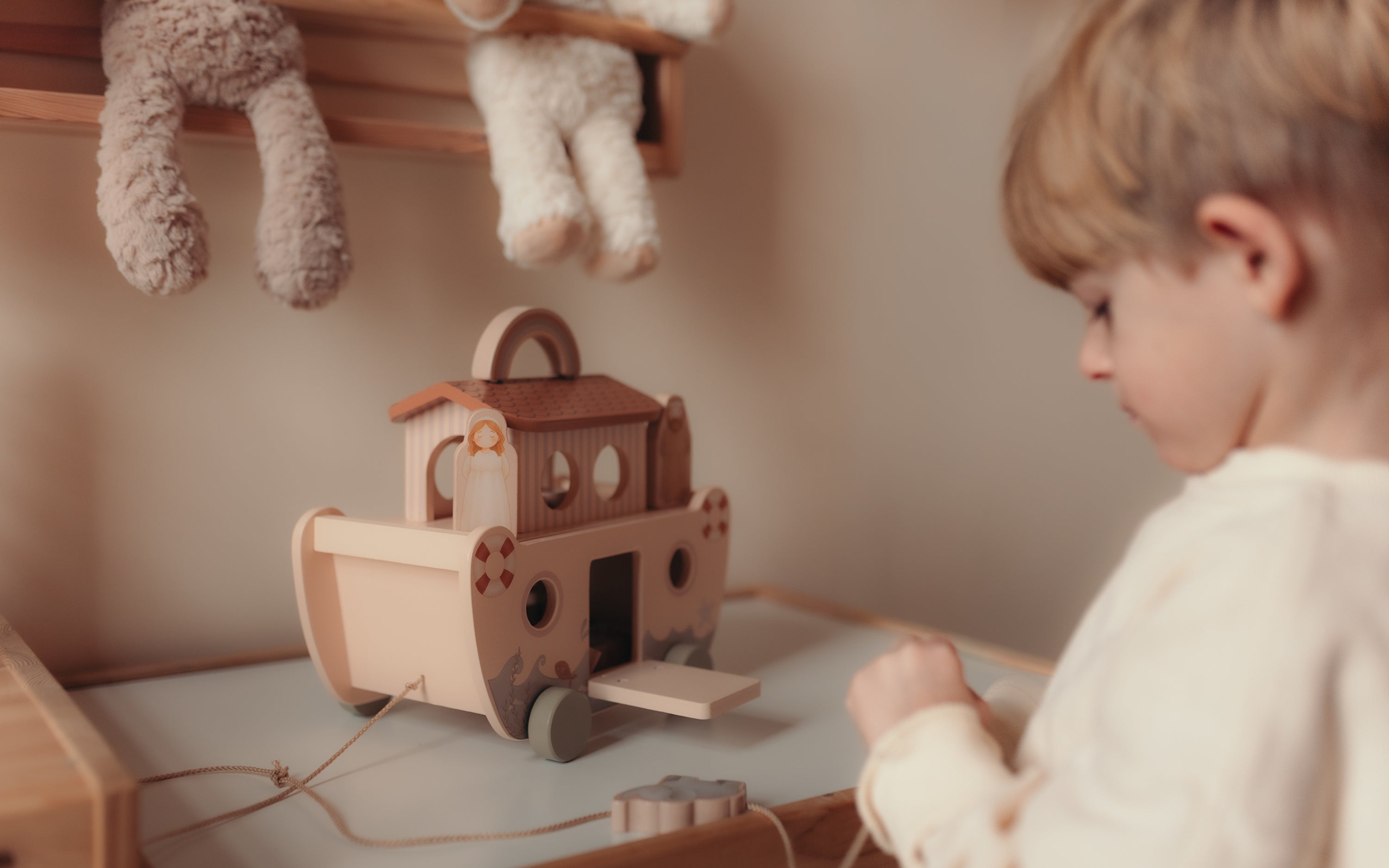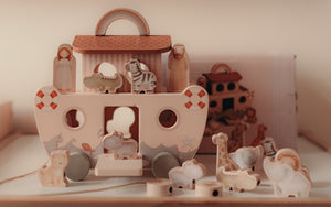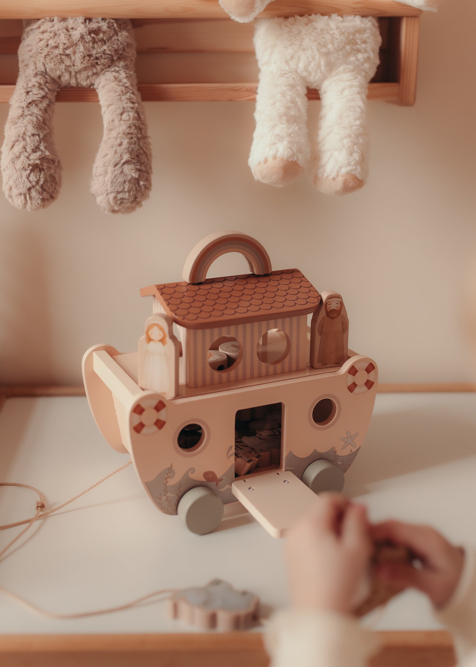 Bevat 22 onderdelen: 14 dieren, een bootje op wieltjes, een regenboog, een trapje en een touwtje met een houten uiteinde om de dieren aan te rijgen, waardoor kleintjes hun fijne motoriek kunnen ontwikkelen. Perfect om mee te spelen, te leren en eindeloze avonturen te beleven!