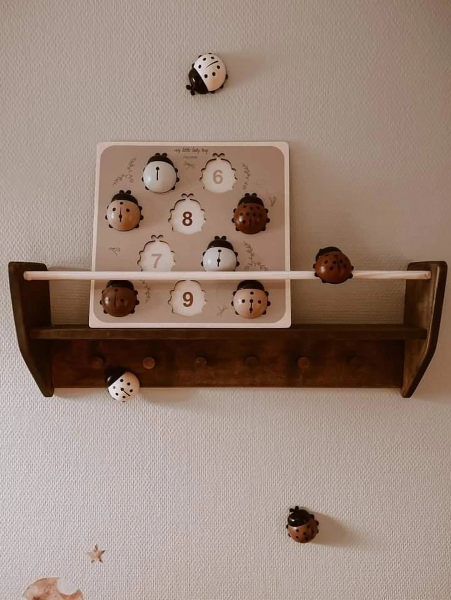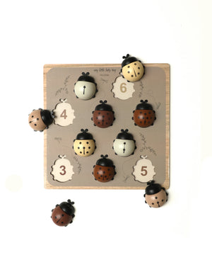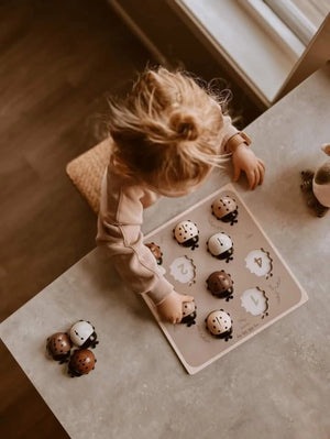 Met deze houten paspuzzel leren de allerkleinsten spelenderwijs tellen. In de eerste fase ontwikkelt hij de fijne motorische coördinatie, de oog-handcoördinatie en de herkenning van vormen en kleuren. In de tweede fase helpt hij ze om hun eerste cijfers te leren en te tellen. Inclusief: 10 Lieveheersbeestjes genummerd door hun vlekken en een bijpassend bakje. Tel de vlekken en kies het juiste nummer. Als je hulp nodig hebt, hoef je alleen maar de kleur van het lieveheersbeestje te vergelijken met de kleur van het nummer.