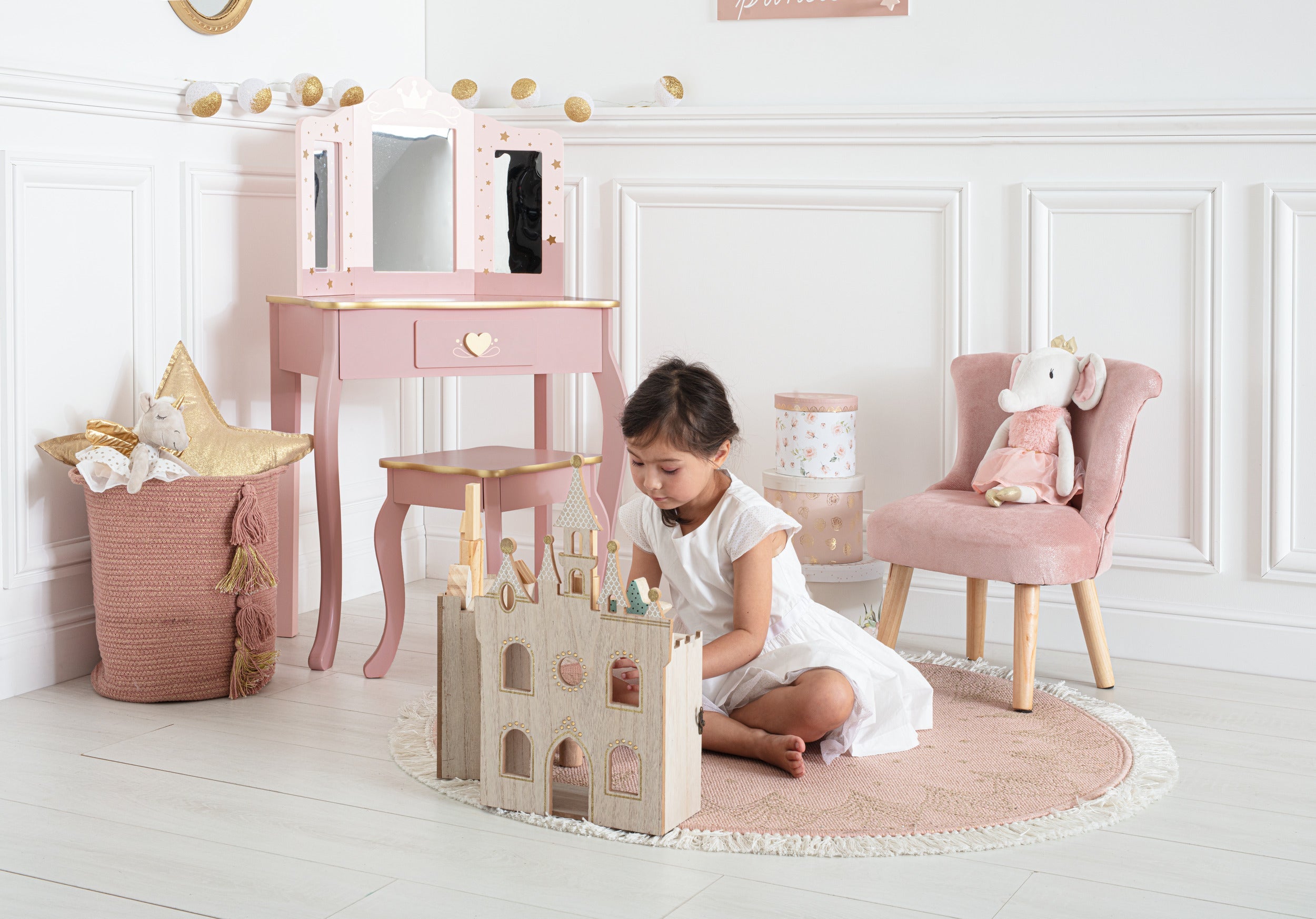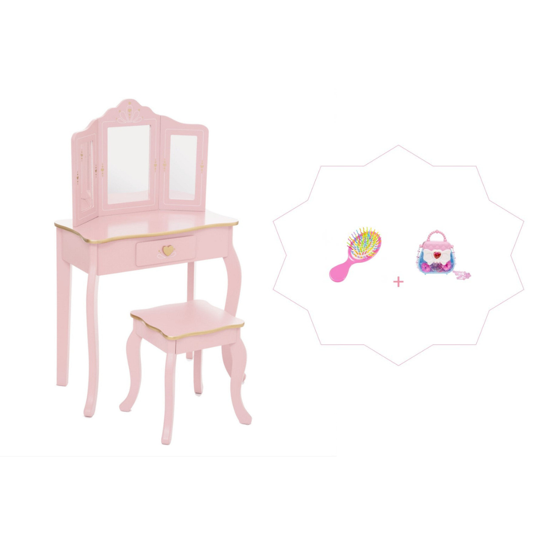 Deze kinder kaptafel is een gegarandeerd succes bij je kleine prinses en kan voor verschillende doeleinden worden gebruikt o.a. voor het spelen als kapsalon, visagiste of nagelstyliste maar ook natuurlijk ook geschikt om aan te knutselen of als bureau. Om ze op weg te helpen hebben we de leuke accessoires toegevoegd aan onze kaptafel, een borstel en een sierraden tasje.