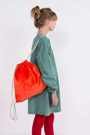 Superzachte sportieve rode tas met trekkoord en saliegroene hengsels. De body is gemaakt van teddy en de voering is waterdicht. afmeting - 37 x 38 cm