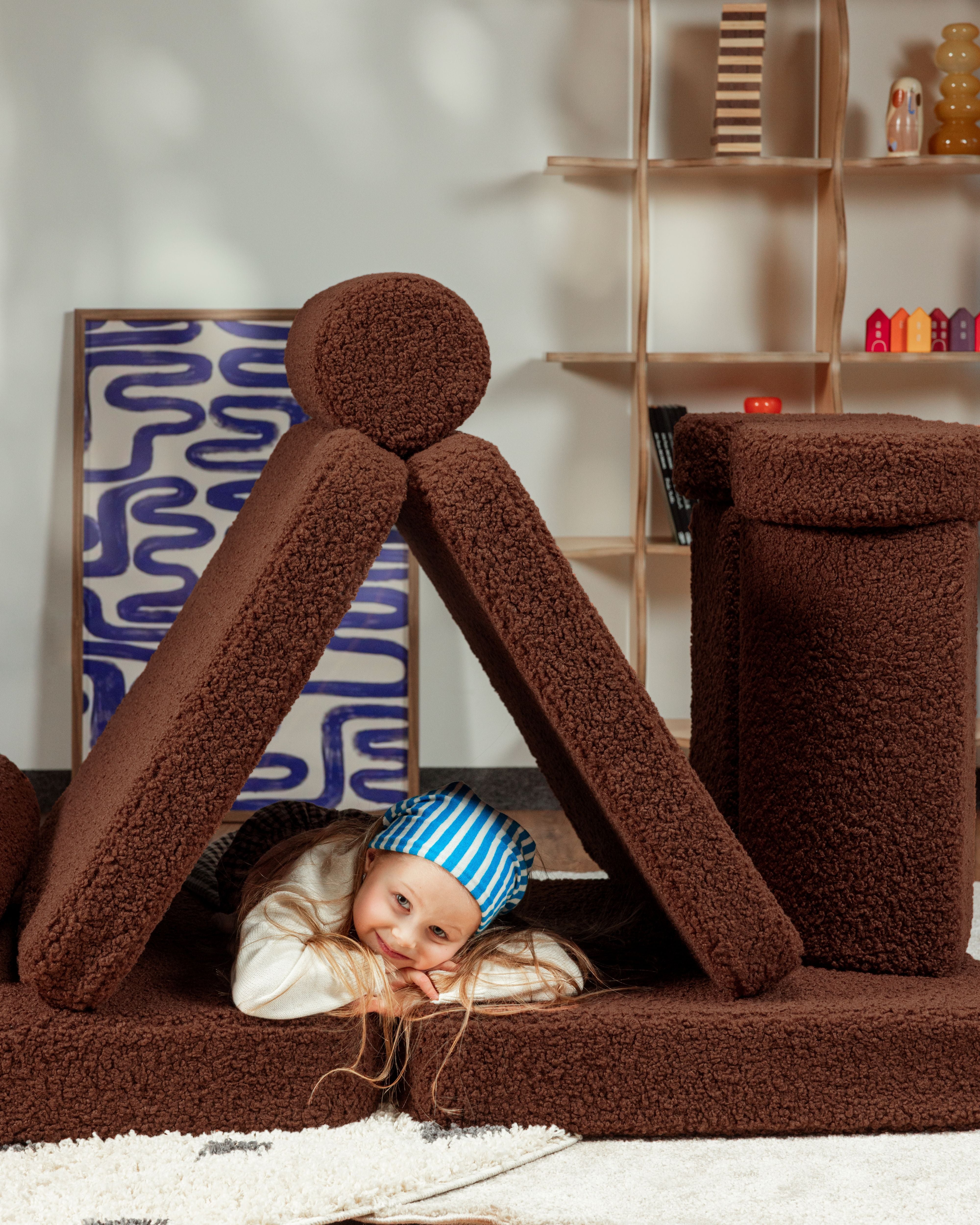 De Wigiwama Settee bestaat uit 9 delen - twee zitkussens, een groot zitkussen, twee driehoekige kussens als rugleuning, twee rolkussens als armleuning en twee ronde kussens - en biedt een perfecte combinatie met onbeperkte mogelijkheden voor fantasierijk spel en ontspanning.